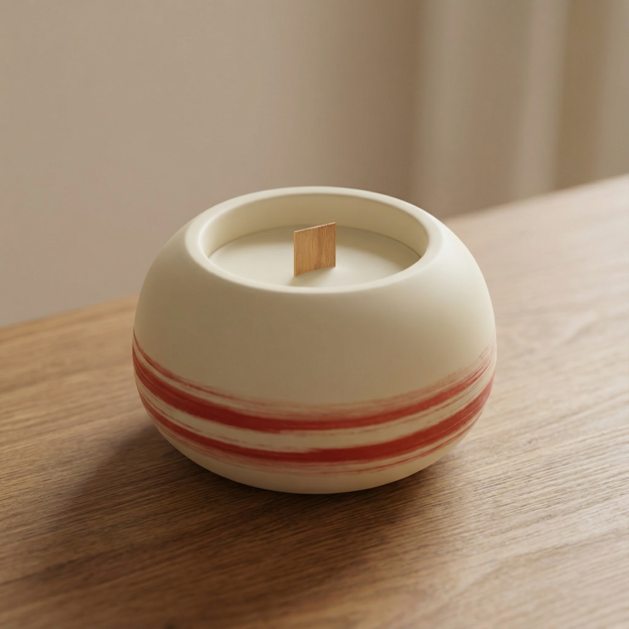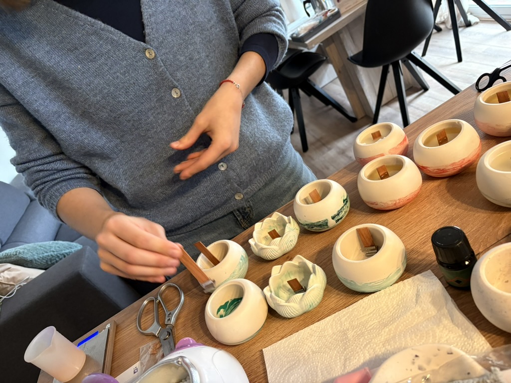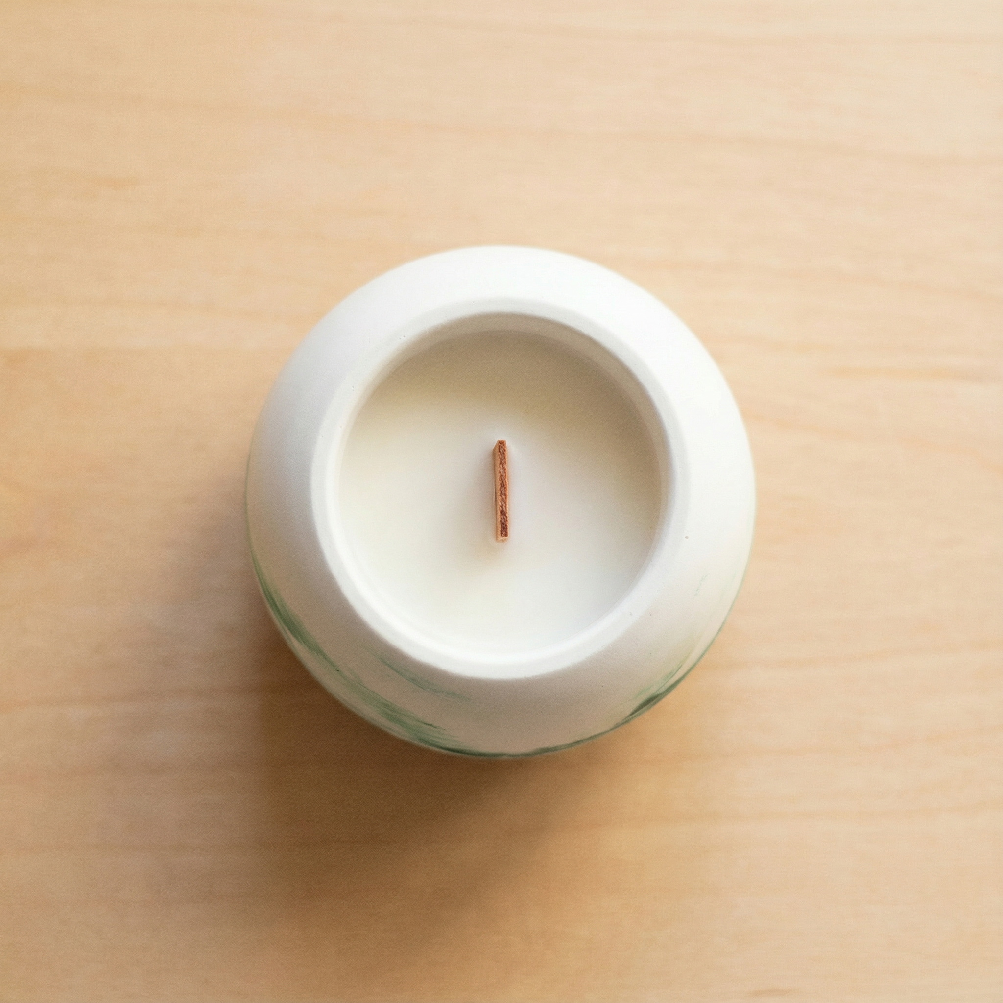 Matériaux : Jesmonite, cire de soja, stéarine végétale, mèche en bois de cerisier, parfum de Grasse